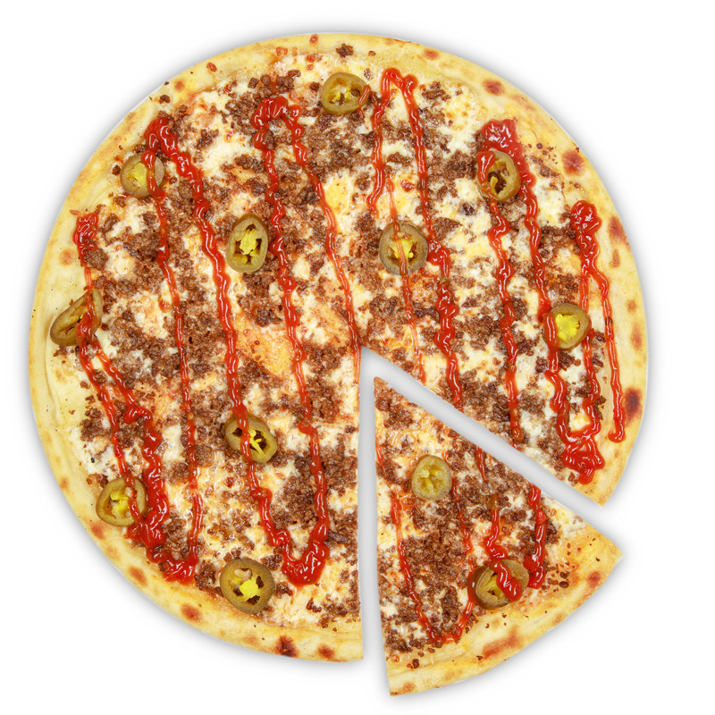 Моцарелла, фарш из телятины, соус сальса, острый перчик халапеньо, томатный соус