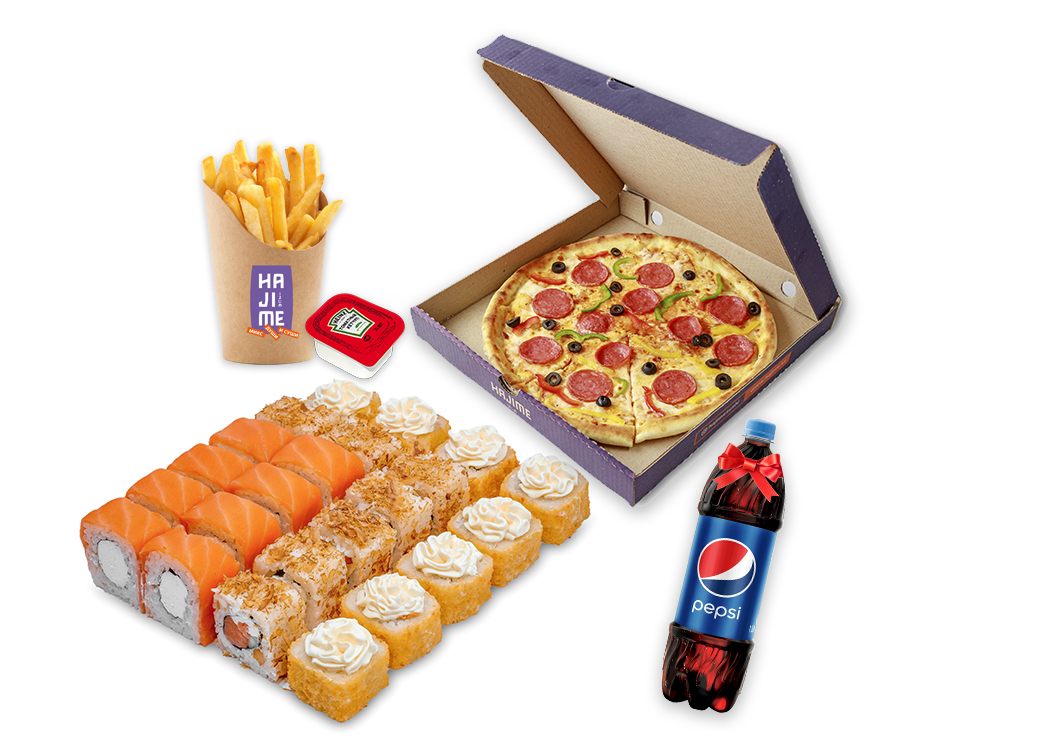 Бонито микс+ Филадельфия+ Темпура микс = 24 шт, Пепперони 35 см, Картофель фри + Кетчуп , Pepsi в подарок